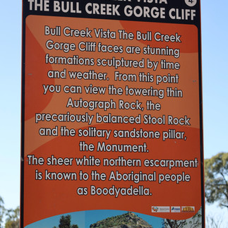 Midway along a good stop is at the Bull Creek Vista lookout area. Looking eastward there are towering sandstone rock formations called Autograph and Stool Rock plus a solitary pillar aptly named The Monument.